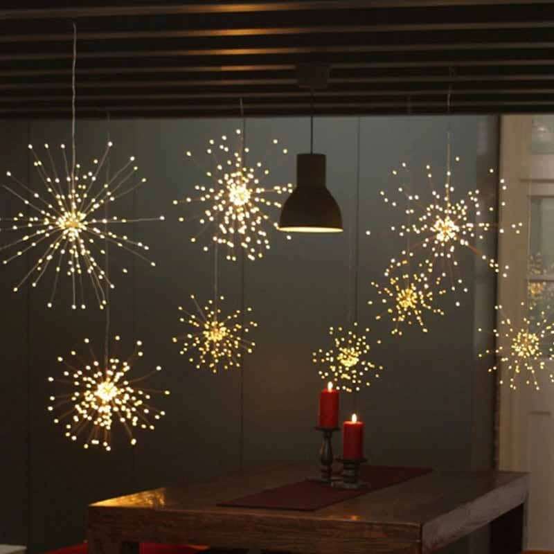 Závěsné slavnostní hvězdné lampy se vzhledem ohňostroje lze instalovat v ložnici, obývacím pokoji, baru a dalších typech interiérů. Může být také použit k dekoraci otevřených prostorů, jako jsou zahrady, terasy a balkóny, protože jsou vodotěsné.
