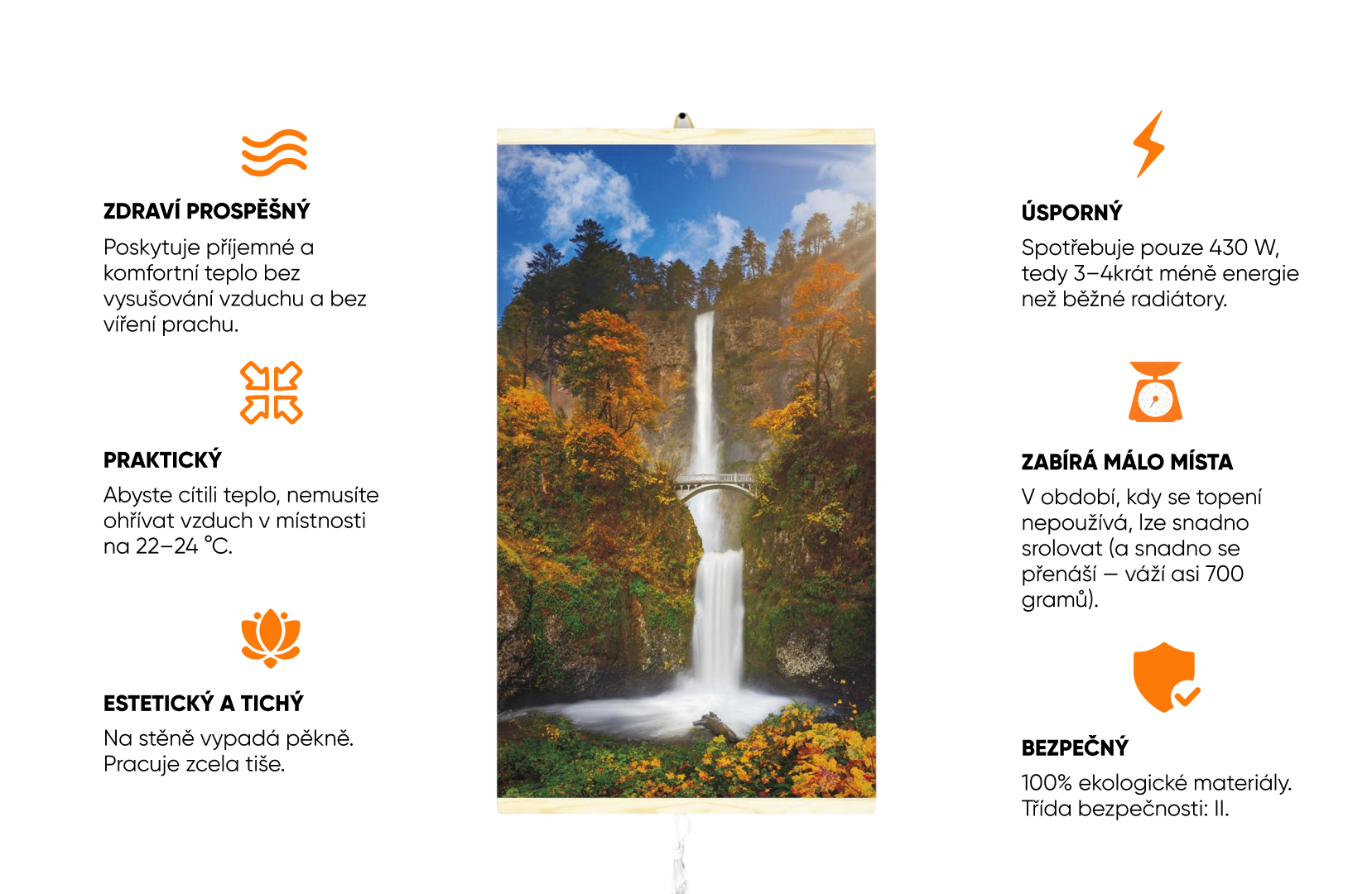Nejen, že poskytuje příjemné teplo v každé místnosti vysoce účinným a kompaktním způsobem, ale také jí dodává nový lesk a barvu s potištěným bezrámovým povrchem, který upoutá pozornost v každé místnosti. Topný panel je velmi plochý – stejně jako obrázek – lze jej tedy zavěsit přímo na zeď, odkud bude sálat příjemné teplo.
